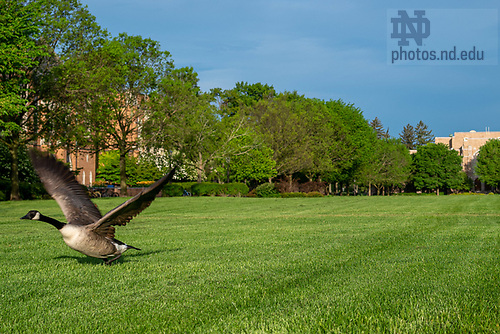 May 20, 2020; A goose takes off on South Quad. (Photo by Matt Cashore/University of Notre Dame)