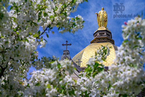 May 5, 2023; Mary statue framed by flowering trees on Main Quad, Spring 2023 (Photo by Matt Cashore/University of Notre Dame)