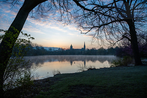 April 22, 2021; Sunrise over St. Mary’s Lake. (Photo by Barbara Johnston/University of Notre Dame)