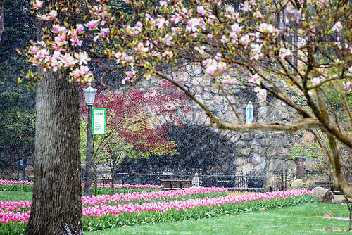 April 21, 2021; A brief April snow shower falls on the Grotto. (Photo by Matt Cashore/University of Notre Dame)