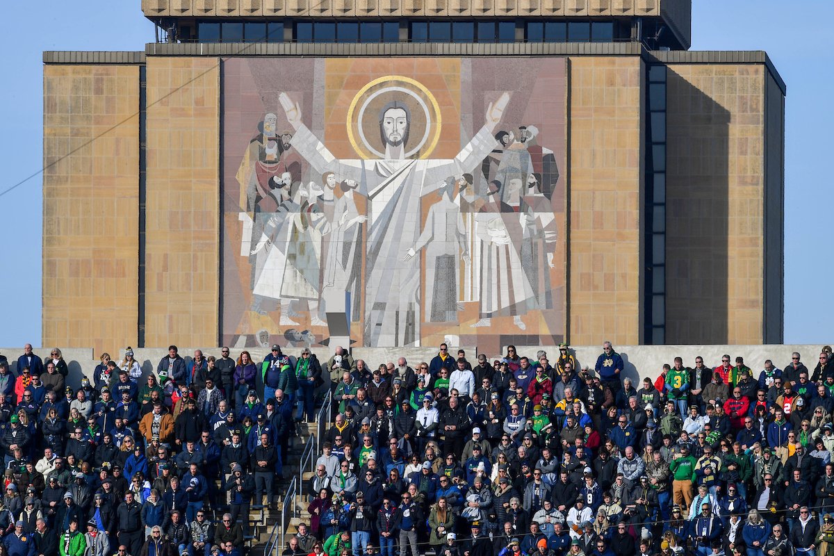 This mural on Hesburgh Library is commonly called "Touchdown Jesus." It measures a towering 134 feet high by 68 feet wide and is composed of more than 5,700 multi-colored pieces of granite. It got its nickname because Jesus has his arms outstretched in the same position a referee uses to signal a touchdown. And it can be seen from inside Notre Dame Stadium. But the actual title of this mural is the “Word of Life.”