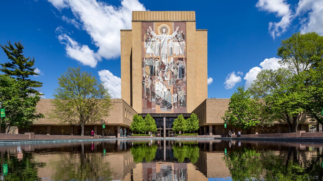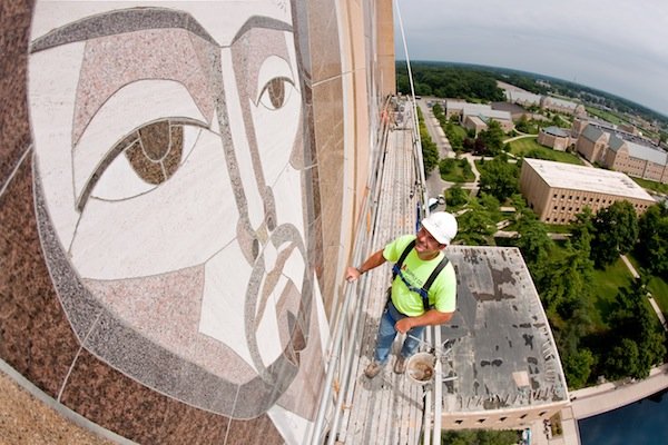 This mural on Hesburgh Library is commonly called "Touchdown Jesus." It measures a towering 134 feet high by 68 feet wide and is composed of more than 5,700 multi-colored pieces of granite. It got its nickname because Jesus has his arms outstretched in the same position a referee uses to signal a touchdown. And it can be seen from inside Notre Dame Stadium. But the actual title of this mural is the “Word of Life.”