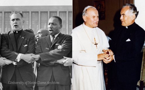 Below the giant mural stands a statue of Father Hesburgh with his good friend and University Executive Vice President, Father “Ned” Joyce, who was also a Holy Cross priest. The two stand together in conversation, as if discussing plans or a grand idea. This is how the two led the University for 35 years, and it is the same posture of dialogue that Notre Dame adopts towards the world at large.