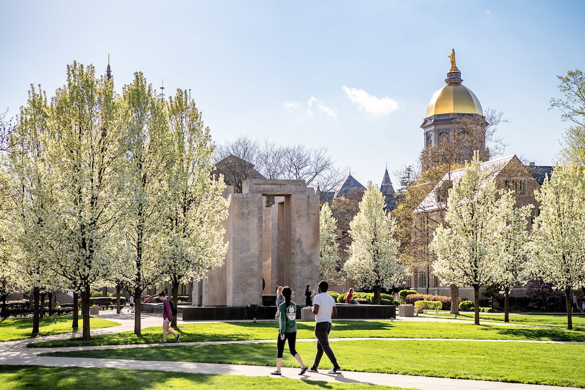 Begin this part of the tour when you are standing facing the front of the Golden Dome, with the Basilica of the Sacred Heart on your left. Take the path behind you and to the right toward the LaFortune Student Center. Continue on the path between LaFortune and Washington Hall, walking towards the library.