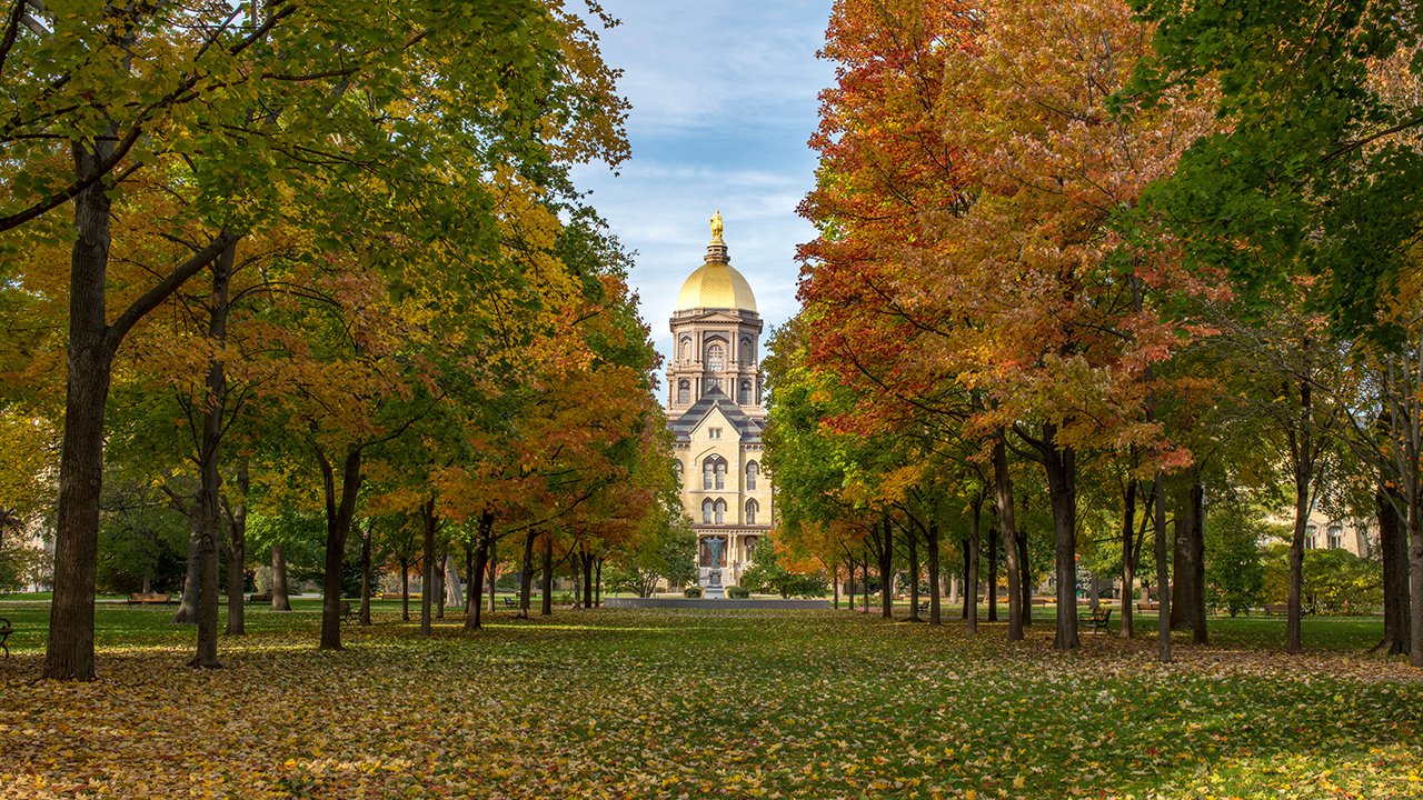 The Basilica of the Sacred Heart to your left is the main worship space on campus, and is consistently ranked as one of the most beautiful college churches in the world. Visitors are welcome during the day at any time the church is not in use for worship. If you’d like to explore the Basilica further, you’ll find interpretive guides inside, including docents during certain hours.